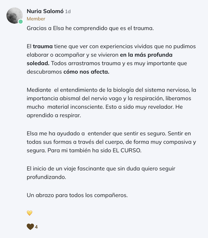 El curso Regúlate es muy completo a nivel práctico y teórico. Elsa nos ha acompañado y sostenido en todo momento, explicando el temario con ejemplos de la vida real, con muchas prácticas somáticas y resolviendo todas nuestras dudas.