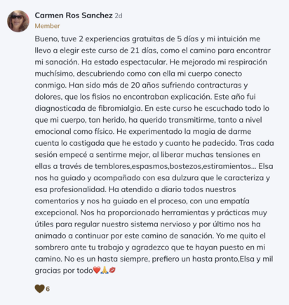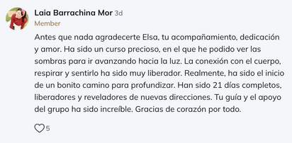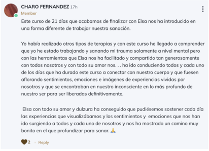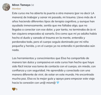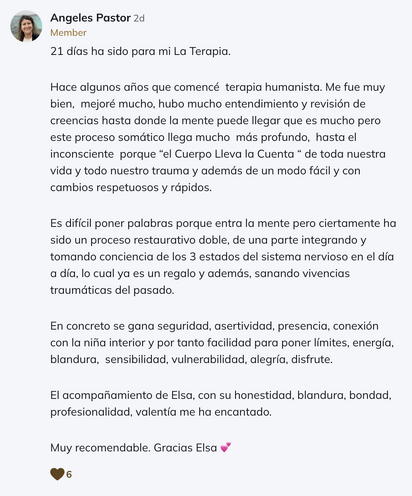 Para mí ha sido una gran oportunidad de verme, entender el porqué de lo que me pasa y sanar trauma. Mil gracias Elsa. 🤗🫶