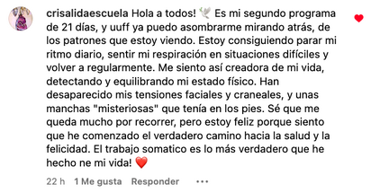 Es un curso espectacular, ofrece muchas herramientas, desde meditaciones, trabajo somático, TRE, tapping...