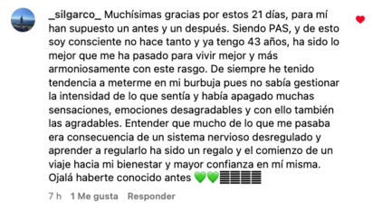 Quedo totalmente agradecida y contenta con el cuidado y cariño proporcionado, y con muchas ganas de seguir con las prácticas de respiración y los recursos de regulación.