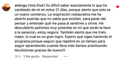 Recomiendo absolutamente el programa de 21 días de breathwork porque me ha permitido recuperar varias millas de seguridad y confianza en mi cuerpo debido a que es una vía totalmente respetuosa y compasiva con la capacidad de nuestro cuerpo. Además, Elsa acompaña sin presión alguna y facilita la información necesaria para que cada persona verifique la capacidad de su sistema nervioso, lo cual me dio bastante calma y seguridad.